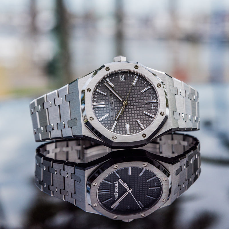 The 2023 Royal Oak 15510ST with a grey dial is an exquisite blend of classic design and modern elegance. The grey sunburst dial creates a dynamic visual effect, reflecting light in different angles, while the stainless steel case and iconic octagonal bezel provide a timeless look that pairs effortlessly with any style, making it a standout piece for both formal and casual occasions.